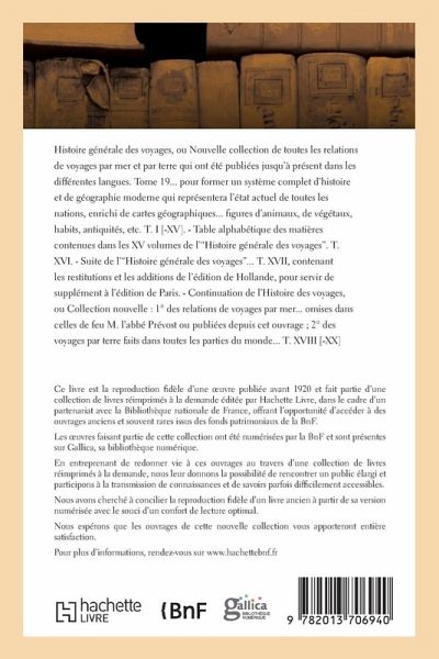Histoire générale des voyages, ou Nouvelle collection de toutes les relations de voyages par mer et par terre qui ont été publiées jusqu'à présent dans les différentes langues. Tome 19 / ... pour former un système complet d'histoire et de géographie moderne qui représentera l'état actuel de toutes les nations, enrichi de cartes géographiques... figures d'animaux, de végétaux, habits, antiquités, etc. T. I [-XV]. - Table alphabétique des matières contenues dans les XV volumes de l'"Histoire générale des voyages". T. XVI. - Suite de l'"Histoire générale des voyages"... T. XVII, contenant les restitutions et les additions de l'édition de Hollande, pour servir de supplément à l'édition de Paris. - Continuation de l'Histoire des voyages, ou Collection nouvelle: 1° des relations de voyages par mer... omises dans celles de feu M. l'abbé Prévost ou publiées depuis cet ouvrage; 2° des voyages par terre faits dans toutes les parties du monde... T. XVIII [-XX] Date de l'édition originale: 1746-1801 Sujet de l'ouvrage: Voyages autour du monde -- Ouvrages avant 1800 Appartient à l'ensemble documentaire: FranceJp0 Le présent ouvrage s'inscrit dans une politique de conservation patrimoniale des ouvrages de la littérature Française mise en place avec la BNF. HACHETTE LIVRE et la BNF proposent ainsi un catalogue de titres indisponibles, la BNF ayant numérisé ces oeuvres et HACHETTE LIVRE les imprimant à la demande. Certains de ces ouvrages reflètent des courants de pensée caractéristiques de leur époque, mais qui seraient aujourd'hui jugés condamnables. Ils n'en appartiennent pas moins à l'histoire des idées en France et sont susceptibles de présenter un intérêt scientifique ou historique. Le sens de notre démarche éditoriale consiste ainsi à permettre l'accès à ces oeuvres sans pour autant que nous en cautionnions en aucune façon le contenu. Pour plus d'informations, rendez-vous sur www.hachettebnf.fr