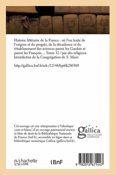 Histoire litteraire de la France: o l'on traite de l'origine et du progres, de la decadence et du retablissement des sciences parmi les Gaulois et parmi les Francois.... Tome 12 / par des religieux benedictins de la Congregation de S. MaurDate de l'edition originale: 1865-1869Sujet de l'ouvrage: Litterature -- Historiographie -- FranceCe livre est la reproduction fidele d'une oeuvre publiee avant 1920 et fait partie d'une collection de livres reimprimes a la demande editee par Hachette Livre, dans le cadre d'un partenariat avec la Bibliotheque nationale de France, offrant l'opportunite d'acceder a des ouvrages anciens et souvent rares issus des fonds patrimoniaux de la BnF.Les oeuvres faisant partie de cette collection ont ete numerisees par la BnF et sont presentes sur Gallica, sa bibliotheque numerique.En entreprenant de redonner vie a ces ouvrages au travers d'une collection de livres reimprimes a la demande, nous leur donnons la possibilite de rencontrer un public elargi et participons a la transmission de connaissances et de savoirs parfois difficilement accessibles.Nous avons cherche a concilier la reproduction fidele d'un livre ancien a partir de sa version numerisee avec le souci d'un confort de lecture optimal. Nous esperons que les ouvrages de cette nouvelle collection vous apporteront entiere satisfaction.Pour plus d'informations, rendez-vous sur www.hachettebnf.frhttp: //gallica.bnf.fr/ark: /12148/bpt6k280369