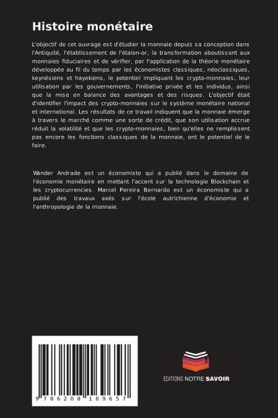 L'objectif de cet ouvrage est d'étudier la monnaie depuis sa conception dans l'Antiquité, l'établissement de l'étalon-or, la transformation aboutissant aux monnaies fiduciaires et de vérifier, par l'application de la théorie monétaire développée au fil du temps par les économistes classiques, néoclassiques, keynésiens et hayekiens, le potentiel impliquant les crypto-monnaies, leur utilisation par les gouvernements, l'initiative privée et les individus, ainsi que la mise en balance des avantages et des risques. L'objectif était d'identifier l'impact des crypto-monnaies sur le système monétaire national et international. Les résultats de ce travail indiquent que la monnaie émerge à travers le marché comme une sorte de crédit, que son utilisation accrue réduit la volatilité et que les crypto-monnaies, bien qu'elles ne remplissent pas encore les fonctions classiques de la monnaie, ont le potentiel de le faire.