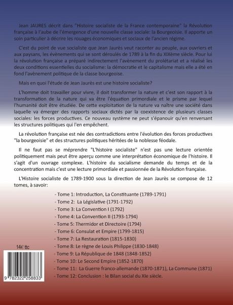 Jean JAURES décrit dans "Histoire socialiste de la France contemporaine" la Révolution française à l'aube de l'émergence d'une nouvelle classe sociale: la Bourgeoisie. Il apporte un soin particulier à décrire les rouages économiques et sociaux de l'ancien régime.C'est du point de vue socialiste que Jean Jaurès veut raconter au peuple, aux ouvriers et aux paysans, les évènements qui se sont déroulés de 1789 à la fin du XIXème siècle.Pour lui la révolution française a préparé indirectement l'avènement du prolétariat et a réalisé les deux conditions essentielles du socialisme: la démocratie et le capitalisme mais elle a été en fond l'avènement politique de la classe bourgeoise.Mais en quoi l'étude de Jean Jaurès est une histoire socialiste?L'homme doit travailler pour vivre, il doit transformer la nature et c'est son rapport à la transformation de la nature qui va être l'équation primordiale et le prisme par lequel l'humanité doit être étudiée. De cette exploitation de la nature va naître une société dans laquelle va émerger des rapports sociaux dictés par la coexistence de plusieurs classes sociales: les forces productives. Ce nouveau système ne peut s'épanouir qu'en renversant les structures politiques qui l'en empêchent.La révolution française est née des contradictions entre l'évolution des forces productives "la bourgeoisie" et des structures politiques héritées de la noblesse féodale.Il ne faut pas se méprendre "L'histoire socialiste" n'est pas une lecture orientée politiquement mais peut être aperçu comme une interprétation économique de l'histoire. Il s'agit d'un ouvrage complexe. L'histoire du socialisme demande du temps et de la concentration mais c'est une lecture primordiale et passionnée de la Révolution française.L'Histoire socialiste de 1789-1900 sous la direction de Jean Jaurès se compose de 12 tomes, à savoir:Tome 1: Introduction, La Constituante (1789-1791)Tome 2: La Législative (1791-1792)Tome 3: La Convention I (1792)Tome 4: La Convention II (1793-1794)Tome 5: Thermidor et Directoire (1794)Tome 6: Consulat et Empire (1799-1815)Tome 7: La Restauration (1815-1830)Tome 8: Le règne de Louis Philippe (1830-1848)Tome 9: La République de 1848 (1848-1852)Tome 10: Le Second Empire (1852-1870)Tome 11: La Guerre franco-allemande (1870-1871), La Commune (1871)Tome 12: Conclusion : le Bilan social du XIXe siècle.