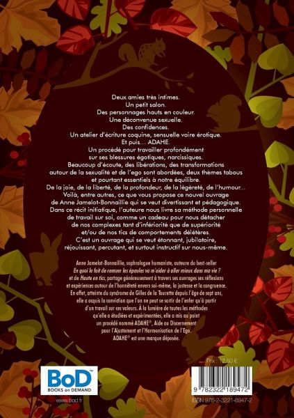 Deux amies très intimes.Un petit salon. Des personnages hauts en couleur. Une déconvenue sexuelle. Des confidences.Un atelier d'écriture coquine,sensuelle voire érotique. Et puis... ADAHE. Un procédé pour travailler profondément sur ses blessures égotiques, narcissiques. Beaucoup d'écoute, des libérations, des transformations autour de la sexualité et de l'ego sont abordées, deux thèmes tabous et pourtant essentiels à notre équilibre. De la joie, de la liberté, de la profondeur, de la légèreté, de l'humour... Voilà, entre autres, ce que vous propose ce nouvel ouvrage de Anne Jamelot-Bonnaillie qui se veut divertissant et pédagogique. Dans ce récit initiatique, l'auteure nous livre sa méthode personnelle de travail sur soi, comme un cadeau pour nous détacher de nos complexes tant d'infériorité que de supériorité et/ou de nos tics de comportements délétères. C'est un ouvrage qui se veut étonnant, jubilatoire, réjouissant, percutant, et surtout instructif sur nous même.