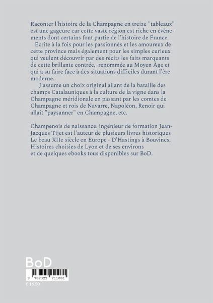 Raconter l'histoire de la Champagne en treize "tableaux" est une gageure car cette vaste région est riche en évènements dont certains font partie de l'histoire de France. Ecrite à la fois pour les passionnés et les amoureux de cette province mais également pour les simples curieux qui veulent découvrir par des récits les faits marquants de cette brillante contrée, renommée au Moyen Âge et qui a su faire face à des situations difficiles durant l'ère moderne.J'assume un choix original allant de la bataille des champs Catalauniques à la culture de la vigne dans la Champagne méridionale en passant par les comtes de Champagne et rois de Navarre, Napoléon et Renoir qui allait "paysanner" en Champagne, etc.