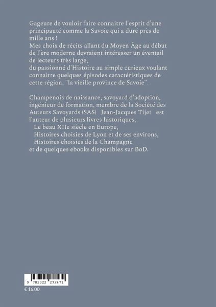 Gageure de vouloir faire connaitre l'esprit d'une principauté comme la Savoie qui a duré près de mille ans !Mes choix de récits historiques allant du Moyen Âge au début de l'ère moderne devraient intéresser un éventail de lecteurs très large, du passionné d'Histoire au simple curieux voulant connaitre quelques épisodes caractéristiques de cette région, "la vieille province de Savoie".