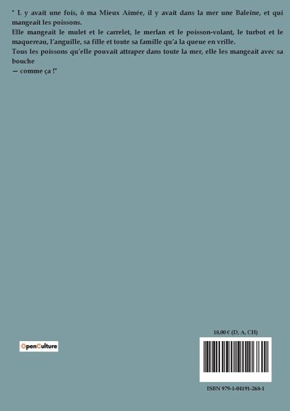 " L y avait une fois, ô ma Mieux Aimée, il y avait dans la mer une Baleine, et qui mangeait les poissons. Elle mangeait le mulet et le carrelet, le merlan et le poisson-volant, le turbot et le maquereau, l¿anguille, sa fille et toute sa famille qüa la queue en vrille. Tous les poissons qüelle pouvait attraper dans toute la mer, elle les mangeait avec sa bouche ¿ comme ça !"