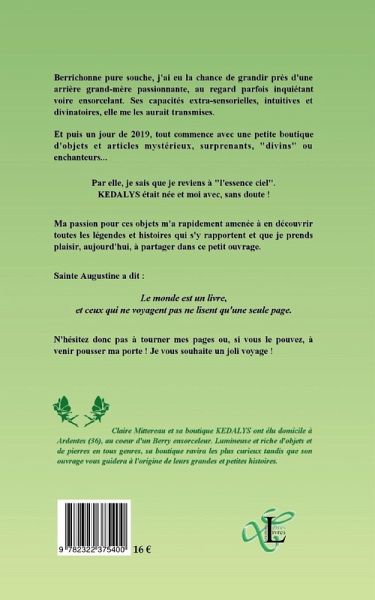 Berrichonne pure souche, j'ai eu la chance de grandir près d'une arrière-grand-mère passionnante, au regard parfois inquiétant voire ensorcelant. Ses capacités extra-sensorielles, intuitives et divinatoires, elle me les aurait transmises.Et puis un jour de 2019, tout commence avec une petite boutique d'objets et articles mystérieux, surprenants, "divins" ou enchanteurs... Par elle, je sais que je reviens à "l'essence ciel". KEDALYS était née et moi avec, sans doute ! Ma passion pour ces objets m'a rapidement amenée à en découvrir toutes les légendes et histoires qui s'y rapportent et que je prends plaisir, aujourd'hui, à partager dans ce petit ouvrage.Sainte Augustine a dit : "le monde est un livre et ceux qui ne voyagent pas, ne lisent qu'une seule page".N'hésitez donc pas à tourner mes pages ou, si vous le pouvez, à venir pousser ma porte ! Je vous souhaite un joli voyage !