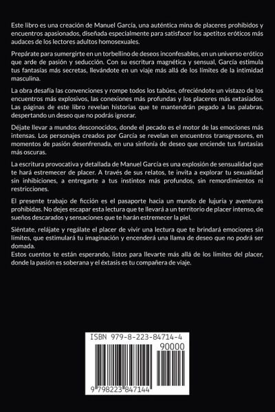 Este libro es una creación de Manuel García, una auténtica mina de placeres prohibidos y encuentros apasionados, diseñada especialmente para satisfacer los apetitos eróticos más audaces de los lectores adultos homosexuales. Prepárate para sumergirte en un torbellino de deseos inconfesables, en un universo erótico que arde de pasión y seducción. Con su escritura magnética y sensual, García estimula tus fantasías más secretas, llevándote en un viaje más allá de los límites de la intimidad masculina. La obra desafía las convenciones y rompe todos los tabúes, ofreciéndote un vistazo de los encuentros más explosivos, las conexiones más profundas y los placeres más extasiados. Las páginas de este libro revelan historias que te mantendrán pegado a las palabras, despertando un deseo que no podrás ignorar. Déjate llevar a mundos desconocidos, donde el pecado es el motor de las emociones más intensas. Los personajes creados por García se revelan en encuentros transgresores, en momentos de pasión desenfrenada, en una sinfonía de deseo que enciende tus fantasías más oscuras. La escritura provocativa y detallada de Manuel García es una explosión de sensualidad que te hará estremecer de placer. A través de sus relatos, te invita a explorar tu sexualidad sin inhibiciones, a entregarte a tus instintos más profundos, sin remordimientos ni restricciones. El presente trabajo de ficción es el pasaporte hacia un mundo de lujuria y aventuras prohibidas. No dejes escapar esta lectura que te llevará a un territorio de placer intenso, de sueños descarados y sensaciones que te harán estremecer la piel. Siéntate, relájate y regálate el placer de vivir una lectura que te brindará emociones sin límites, que estimulará tu imaginación y encenderá una llama de deseo que no podrá ser domada. Estos cuentos te están esperando, listos para llevarte más allá de los límites del placer, donde la pasión es soberana y el éxtasis es tu compañera de viaje.