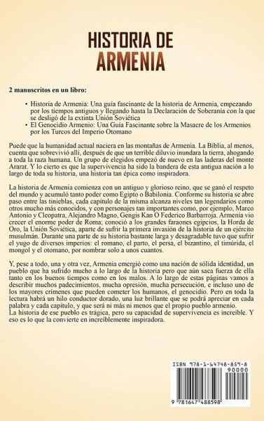 Two manuscritos completos en 1 libroHistoria de Armenia: Una guía fascinante de la historia de Armenia, empezando por los tiempos antiguos y llegando hasta la Declaración de Soberanía con la que se desligó de la extinta Unión Soviética El Genocidio Armenio: Una Guía Fascinante sobre la Masacre de los Armenios por los Turcos del Imperio Otomano La historia de Armenia comienza con un antiguo y glorioso reino, que se ganó el respeto del mundo y acumuló tanto poder como Egipto o Babilonia. Conforme su historia se abre paso entre las tinieblas, cada capítulo de la misma alcanza niveles tan legendarios como otros mucho más conocidos, y con personajes tan importantes como, por ejemplo, Marco Antonio y Cleopatra, Alejandro Magno, Gengis Kan O Federico Barbarroja. Armenia vio crecer el enorme poder de Roma; conoció a los grandes faraones egipcios, la Horda de Oro, la Unión Soviética, aparte de sufrir la primera invasión de la historia de un ejército musulmán. Durante una parte de su historia bastante larga y desagradable tuvo que sufrir el yugo de diversos imperios: el romano, el parto, el persa, el bizantino, el timúrida, el mongol y el otomano, por nombrar solo a unos cuantos. La primera parte de este libro incluye:El hogar del Edén Ascenso y caída de Urartu Armenia conquistada Un imperio por derecho propio Entre dos fuegos Iluminación Los inmortales y los elefantes de guerra Un emperador armenio El estado de la cruzada Conquistados La primera deportación Genocidio Por fin, la libertad Estudio en terciopelo ¡Y mucho, mucho más! Segunda parte de este libro, usted:El Problema Armenio El Imperio Otomano Las Primeras Masacres La Revolución Joven Turca El Mundo Estalla en Guerra Domingo Rojo Marcha de la Muerte Mil Huérfanos El Mar Negro se Torna Rojo Niños Secuestrados Justicia Operación Némesis Negación Luchando por la Libertad ¡Y mucho, mucho más! ¡Obtenga ahora este libro para aprender más sobre Historia de Armenia y el genocidio armenio