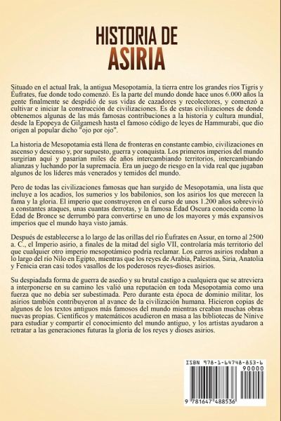 Explore la fascinante historia del Imperio asirio Situado en el actual Irak, la antigua Mesopotamia, la tierra entre los grandes ríos Tigris y Éufrates, fue donde todo comenzó. Es la parte del mundo donde hace unos 6.000 años la gente finalmente se despidió de sus vidas de cazadores y recolectores, y comenzó a cultivar e iniciar la construcción de civilizaciones. Es de estas civilizaciones de donde obtenemos algunas de las más famosas contribuciones a la historia y cultura mundial, desde la Epopeya de Gilgamesh hasta el famoso código de leyes de Hammurabi, que dio origen al popular dicho "ojo por ojo". La historia de Mesopotamia está llena de fronteras en constante cambio, civilizaciones en ascenso y descenso y, por supuesto, guerra y conquista. Los primeros imperios del mundo surgirían aquí y pasarían miles de años intercambiando territorios, intercambiando alianzas y luchando por la supremacía. Era un juego de riesgo de la vida real que jugaban algunos de los líderes más venerados y temidos del mundo. Pero de todas las civilizaciones famosas que han surgido de Mesopotamia, una lista que incluye a los acadios, los sumerios y los babilonios, son los asirios los que merecen la fama y la gloria. El imperio que construyeron en el curso de unos 1.200 años sobrevivió a constantes ataques, unas cuantas derrotas, y la famosa Edad Oscura, conocida como la Edad de Bronce, se derrumbó para convertirse en uno de los mayores y más expansivos imperios que el mundo haya visto jamás. En Historia de Asiria: Una guía fascinante de los asirios y su poderoso imperio en la antigua Mesopotamia, usted descubrirá temas como:Los asirios llegan a Mesopotamia: el comienzo del período asirio El nacimiento de una civilización: Del antiguo Imperio asirio al Imperio asirio medio El comienzo del Imperio neoasirio La expansión imperial y la Edad de Oro del Imperio neoasirio La Caída del Imperio Gobierno asirio El ejército asirio La vida en el Imperio asirio Cultura asiria: Arte, Matemáticas y Ciencia Religión asiria ¡Y mucho, mucho más! ¡Obtenga este libro ahora para aprender más sobre la historia asiria!