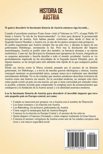 Si quiere descubrir la fascinante historia de Austria entonces siga leyendo... Cuando el presidente austríaco Franz Jonas visitó el Vaticano en 1971, el papa Pablo VI llamó a Austria "la isla de los bienaventurados". Lo hizo para destacar la pronunciada recuperación de Austria. Solo habían pasado veinticinco años desde el final de la Segunda Guerra Mundial, y Austria era ya uno de los países europeos más prósperos. Se podría argumentar que Austria siempre fue un país rico, y durante la época de sus gobernantes Habsburgo, ciertamente lo fue. Pero tras la disolución del Imperio austrohúngaro, Austria se perdió entre dos mundos: su herencia alemana y su nación multiétnica. Como tal, fue fácil para la Alemania nazi apropiarse de Austria, integrarla en su esquema antisemita y hacerla desafiar a todo el mundo occidental. Austria se vio profundamente implicada en las atrocidades de la Segunda Guerra Mundial, pero, de alguna manera, se las arregló para salir adelante más rápido de lo que cualquiera podría esperar. Desde sus inicios como la Marca oriental, pasando por el ascenso de su dinastía gobernante, los Habsburgo, y a través de muchas guerras ideológicas y étnicas, Austria consiguió mantener su personalidad única, aunque nunca tuvo realmente una identidad estrictamente definida. No es de extrañar que muchos estudiosos describan la historia de Austria como una historia sin nación. En la sociedad moderna, no siempre está claro cómo puede existir un país sin una nación, así que si tiene curiosidad por entender cómo es posible, continúe leyendo para comprender la compleja serie de acontecimientos que condujeron a la fundación de la Austria actual y a la identidad austriaca moderna. Lea la fascinante historia de Austria para descubrir el increíble impacto que tuvo este pequeño país en Europa central, así como: * Cuándo se mencionó por primera vez a Austria con el nombre de Österreich * Los limes romanos y su relación con Austria * Los Babenberg, los primeros gobernantes de Austria * Cómo los Habsburgo se hicieron con el poder * Qué significa A.E.I.O.U. y cómo se traduce en el derecho divino a gobernar * Aprenda todo sobre los Habsburgo como emperadores del Sacro Imperio Romano Germánico * Cómo afrontó Austria la Reforma y la Contrarreforma * Los gobernantes ilustrados del Imperio de los Habsburgo * Cómo surgió la monarquía dual de Austria-Hungría * Conozca la revolución en Europa Central y el ascenso de los eslavos * Quién disparó a Francisco Fernando y cómo empezó realmente la Gran Guerra * Cómo Austria se unió a Alemania y se convirtió en un Estado nazi * Conozca el ascenso vertiginoso de Austria como uno de los estados europeos más ricos y con mayor seguridad social ¡Obtenga este libro ahora para saber más sobre la historia de Austria!