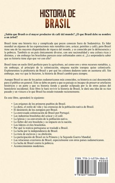¿Sabía que Brasil es el mayor productor de café del mundo? ¿O que Brasil debe su nombre a un árbol? Brasil tiene una historia rica y complicada que pocos conocen fuera de Sudamérica. Es líder mundial en algunas de las exportaciones más rentables (oro, azúcar, petróleo y café), pero Brasil tiene una de las mayores disparidades de riqueza del mundo, y es conocido por la delincuencia y la pobreza. También es un país étnicamente diverso, con una nacionalidad y una cultura ricas y distintas, y sin embargo los brasileños parecen estar enfrentados entre sí. ¿Le sorprendería saber que su historia tiene algo que ver con ello? Brasil tiene un suelo fértil perfecto para la agricultura, así como oro y otros recursos rentables, y, sin embargo, al principio de la colonización, ninguna nación europea quiso colonizarlo. Exploraremos la prehistoria de Brasil y por qué los colonos dudaron tanto en asentarse allí. Sin embargo, una vez que lo hicieron, la historia de Brasil cambió para siempre. Aunque Brasil es uno de los países sudamericanos más conocidos, su historia es casi desconocida para el público en general. Esto se debe en parte a que su paisaje es incapaz de preservar artefactos históricos y en parte a que su historia tiende a quedar eclipsada por la de otros países del hemisferio occidental. Este libro le hará revivir la historia de Brasil, le dará una idea de su rico pasado y un vistazo a lo que Brasil ha estado tratando recientemente. En este libro, aprenderá lo siguiente: Los orígenes de los primeros pueblos de Brasil. La dieta, el estilo de vida y las creencias de la población nativa de Brasil. El desinterés de los europeos por Brasil. La enrevesada colonización de Brasil por Portugal. Las industrias brasileñas del azúcar y el café. La Iglesia y su conversión de la población nativa. La fiebre del oro brasileña y su impacto en la nación. Los líderes civiles brasileños. Por qué la realeza portuguesa se trasladó a Brasil. La lucha por la independencia de Brasil. La trata de esclavos y su abolición. La participación de Brasil en la Primera y la Segunda Guerra Mundial. Las relaciones exteriores de Brasil, especialmente con otros países sudamericanos. La lucha de Brasil contra la pobreza. Acontecimientos modernos.