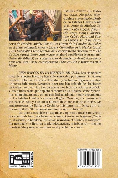 EMILIO CUETO (Havana, 1944). Lawyer, collector and researcher. He lives in the United States since 1961. Author of Mialhe's Colonial Cuba (1992), Cuba in Old Maps (1999), Illustrating Cuba's Flora and Fauna (2002) La Cuba Pintoresca de Frédéric Mialhe (The Picturesque Cuba of Frédéric Mialhe) (2010), La Virgen de la Caridad del Cobre en el alma del pueblo cubano (Our Lady of Charity in the soul of the Cuban people) (2014), Camagüey en la Música (Camagüey in its Music) (2015) and Las Litografías santiagueras del Departamento Oriental de la Isla de Cuba (The lithographs from Santiago de Cuba of the Eastern Department of the Island of Cuba) (2015). Between 2008 and 2013 he collaborated with Florida International University (Miami) in the organization of concerts related to Cuban music. He has another book in preparation: Cuba en USA (Cuba in the USA) y Matanzas en la Mano (Matanzas in the Hand). CIEN BARCOS EN LA HISTORIA DE CUBA (ONE HUNDRED BOATS IN THE HISTORY OF CUBA). The main events of our History have been marked by boats. In remote times, Cuba was a barren territory ... and our first inhabitants arrived on ships. We became an island populated by Caribbean aborigines, but with Christopher Columbus' three caravels we became s a Spanish colony. And that we were until the Maine exploded in Havana, making us an independent country but very dependent on the United States. And then the Granma arrived, which routed the Island to the East and a good number of Cubans to the North. The boats of the Bay of Pigs tried, without success, to open a new chapter. All these boats made us Spanish, English and American. But, above all, they made us Cubans: With what they brought (Cachita, the shield, the flag, the Marti's Simple Verses, baseball, the butterfly, the national flower) —and what they took (emigration, sugar, the habanera)— we made our Cuba and we became the people that we are today.