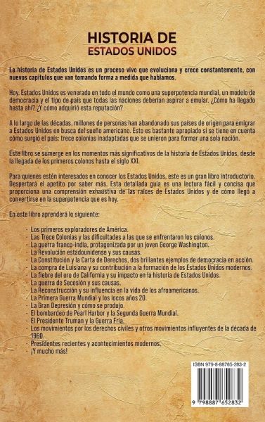 La historia de Estados Unidos es un proceso vivo que evoluciona y crece constantemente, con nuevos capítulos que van tomando forma a medida que hablamos. Hoy, Estados Unidos es venerado en todo el mundo como una superpotencia mundial, un modelo de democracia y el tipo de país que todas las naciones deberían aspirar a emular. ¿Cómo ha llegado hasta ahí? ¿Y cómo adquirió esta reputación? A lo largo de las décadas, millones de personas han abandonado sus países de origen para emigrar a Estados Unidos en busca del sueño americano. Esto es bastante apropiado si se tiene en cuenta cómo surgió el país: trece colonias inadaptadas que se unieron para formar una sola nación. Este libro se sumerge en los momentos más significativos de la historia de Estados Unidos, desde la llegada de los primeros colonos hasta el siglo XXI. Para quienes estén interesados en conocer los Estados Unidos, este es un gran libro introductorio. Despertará el apetito por saber más. Esta detallada guía es una lectura fácil y concisa que proporciona una comprensión exhaustiva de las raíces de Estados Unidos y de cómo llegó a convertirse en la superpotencia que es hoy. En este libro aprenderá lo siguiente: Los primeros exploradores de América. Las Trece Colonias y las dificultades a las que se enfrentaron los colonos. La guerra franco-india, protagonizada por un joven George Washington. La Revolución estadounidense y sus causas. La Constitución y la Carta de Derechos, dos brillantes ejemplos de democracia en acción. La compra de Luisiana y su contribución a la formación de los Estados Unidos modernos. La fiebre del oro de California y su impacto en la historia de Estados Unidos. La guerra de Secesión y sus causas. La Reconstrucción y su influencia en la vida de los afroamericanos. La Primera Guerra Mundial y los locos años 20. La Gran Depresión y cómo se produjo. El bombardeo de Pearl Harbor y la Segunda Guerra Mundial. El Presidente Truman y la Guerra Fría. Los movimientos por los derechos civiles y otros movimientos influyentes de la década de 1960. Presidentes recientes y acontecimientos modernos. ¡Y mucho más!
