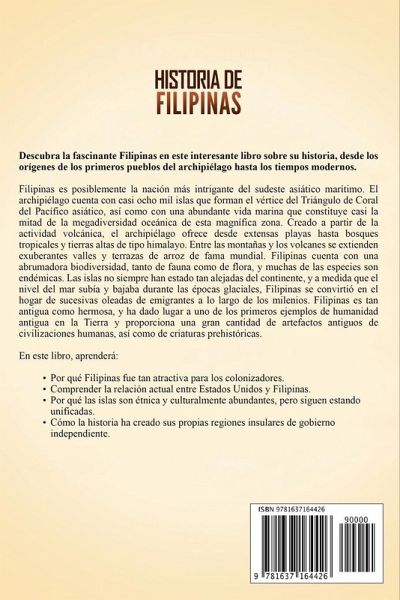 Descubra la fascinante Filipinas en este interesante libro sobre su historia, desde los orígenes de los primeros pueblos del archipiélago hasta los tiempos modernos. Filipinas es posiblemente la nación más intrigante del sudeste asiático marítimo. El archipiélago cuenta con casi ocho mil islas que forman el vértice del Triángulo de Coral del Pacífico asiático, así como con una abundante vida marina que constituye casi la mitad de la megadiversidad oceánica de esta magnífica zona. Creado a partir de la actividad volcánica, el archipiélago ofrece desde extensas playas hasta bosques tropicales y tierras altas de tipo himalayo. Entre las montañas y los volcanes se extienden exuberantes valles y terrazas de arroz de fama mundial. Filipinas cuenta con una abrumadora biodiversidad, tanto de fauna como de flora, y muchas de las especies son endémicas. Las islas no siempre han estado tan alejadas del continente, y a medida que el nivel del mar subía y bajaba durante las épocas glaciales, Filipinas se convirtió en el hogar de sucesivas oleadas de emigrantes a lo largo de los milenios. Filipinas es tan antigua como hermosa, y ha dado lugar a uno de los primeros ejemplos de humanidad antigua en la Tierra y proporciona una gran cantidad de artefactos antiguos de civilizaciones humanas, así como de criaturas prehistóricas. Filipinas está además dotada de abundantes recursos minerales y metálicos, y en la era cristiana, los poderosos principados filipinos se basaban en el comercio exterior que surgía en lugares estratégicos de las antiguas rutas comerciales marítimas. Las interacciones de los filipinos con los reinos indios de Java y Sumatra se fusionaron con las influencias de Arabia y del continente asiático. El comercio, la piratería, los matrimonios mixtos y la mezcla cultural crearon una cultura archipelágica diversa y única. Una vez que llegaron las influencias coloniales en el siglo XVI, Filipinas se relacionó principalmente con el sultanato de Brunéi de Borneo, China y Japón. Los colonos españoles acabaron teniendo el control de Filipinas, que demarcaron y bautizaron, a finales del siglo XVI, y mantuvieron la soberanía sobre las islas durante más de trescientos años. Durante la primera mitad del siglo XX, los estadounidenses controlaron Filipinas, sobre todo como fortaleza militar estratégica. Los estadounidenses y los filipinos lucharon juntos para deshacerse de la ocupación japonesa durante la Segunda Guerra Mundial, y finalmente, en 1946, Filipinas se convirtió en un estado independiente. El pueblo filipino, todavía muy influenciado por Occidente debido a su historia, es mayoritariamente católico y el inglés es uno de sus principales idiomas. La belleza, la historia y la diversidad cultural aseguran la tradición de este archipiélago como la "Perla de los Mares de Oriente". En este libro, aprenderá:Que Filipinas es una zona de megadiversidad biológica y marítima. Por qué las islas tienen una de las historias más antiguas y con más capas de la Tierra. Por qué Filipinas fue tan atractiva para los colonizadores. Cómo consiguieron los españoles gobernar un archipiélago tan diverso durante más de tres siglos. Comprender la relación actual entre Estados Unidos y Filipinas. Por qué las islas son étnica y culturalmente abundantes, pero siguen estando unificadas. Cómo la historia ha creado sus propias regiones insulares de gobierno independiente. ¡Obtenga este libro ahora para saber más sobre la historia de Filipinas!