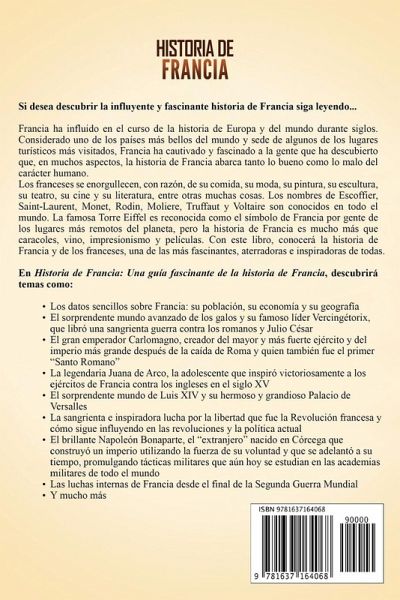 Si desea descubrir la influyente y fascinante historia de Francia siga leyendo... Francia ha influido en el curso de la historia de Europa y del mundo durante siglos. Considerado uno de los países más bellos del mundo y sede de algunos de los lugares turísticos más visitados, Francia ha cautivado y fascinado a la gente que ha descubierto que, en muchos aspectos, la historia de Francia abarca tanto lo bueno como lo malo del carácter humano. Los franceses se enorgullecen, con razón, de su comida, su moda, su pintura, su escultura, su teatro, su cine y su literatura, entre otras muchas cosas. Los nombres de Escoffier, Saint-Laurent, Monet, Rodin, Moliere, Truffaut y Voltaire son conocidos en todo el mundo. La famosa Torre Eiffel es reconocida como el símbolo de Francia por gente de los lugares más remotos del planeta, pero la historia de Francia es mucho más que caracoles, vino, impresionismo y películas. Con este libro, conocerá la historia de Francia y de los franceses, una de las más fascinantes, aterradoras e inspiradoras de todas. En Historia de Francia: Una guía fascinante de la historia de Francia, descubrirá temas como:Los datos sencillos sobre Francia: su población, su economía y su geografía El sorprendente mundo avanzado de los galos y su famoso líder Vercingétorix, que libró una sangrienta guerra contra los romanos y Julio César El gran emperador Carlomagno, creador del mayor y más fuerte ejército y del imperio más grande después de la caída de Roma y quien también fue el primer "Santo Romano" La legendaria Juana de Arco, la adolescente que inspiró victoriosamente a los ejércitos de Francia contra los ingleses en el siglo XV El sorprendente mundo de Luis XIV y su hermoso y grandioso Palacio de Versalles La sangrienta e inspiradora lucha por la libertad que fue la Revolución francesa y cómo sigue influyendo en las revoluciones y la política actual El brillante Napoleón Bonaparte, el "extranjero" nacido en Córcega que construyó un imperio utilizando la fuerza de su voluntad y que se adelantó a su tiempo, promulgando tácticas militares que aún hoy se estudian en las academias militares de todo el mundo La trágica guerra franco-prusiana y cómo dio lugar a las sangrientas guerras del siglo XX en Europa El valiente papel de Francia en la Primera Guerra Mundial La tragedia de la Segunda Guerra Mundial, la resistencia francesa y la colaboración Las luchas internas de Francia desde el final de la Segunda Guerra Mundial Y mucho más ¡Adquiera ahora este libro para conocer mejor la historia de Francia!