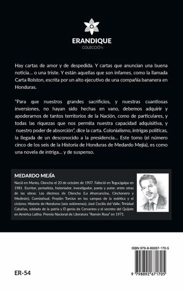 Hay cartas de amor y de despedida. Y cartas que anuncian una buena noticia... o una triste. Y están aquellas que son infames, como la llamada Carta Rolston, escrita por un alto ejecutivo de una compañía bananera en Honduras. "Para que nuestros grandes sacrificios, y nuestras cuantiosas inversiones, no hayan sido hechas en vano, debemos adquirir y apoderarnos de tantos territorios de la Nación, como de particulares, y todas las riquezas que nos permita nuestra capacidad adquisitiva, y nuestro poder de absorción", dice la carta. Colonialismo, intrigas políticas, la llegada de un desconocido a la presidencia... Este tomo (el número cinco de los seis de la Historia de Honduras de Medardo Mejía), es como una novela de intriga... y de suspenso.