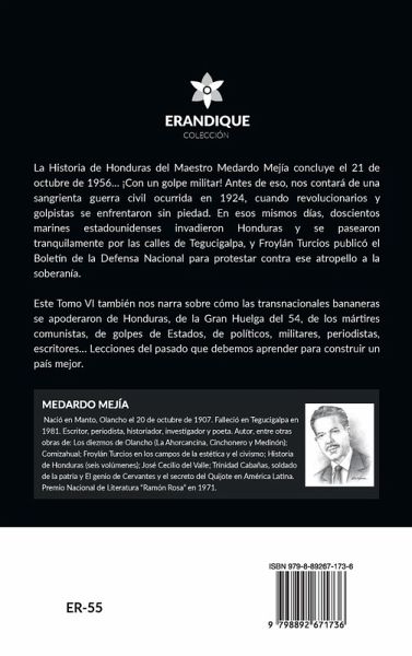 La Historia de Honduras del Maestro Medardo Mejía concluye el 21 de octubre de 1956... ¡Con un golpe militar! Antes de eso, nos contará de una sangrienta guerra civil ocurrida en 1924, cuando revolucionarios y golpistas se enfrentaron sin piedad. En esos mismos días, doscientos marines estadounidenses invadieron Honduras y se pasearon tranquilamente por las calles de Tegucigalpa, y Froylán Turcios publicó el Boletín de la Defensa Nacional para protestar contra ese atropello a la soberanía. Este Tomo VI también nos narra sobre cómo las transnacionales bananeras se apoderaron de Honduras, de la Gran Huelga del 54, de los mártires comunistas, de golpes de Estados, de políticos, militares, periodistas, escritores... Lecciones del pasado que debemos aprender para construir un país mejor.