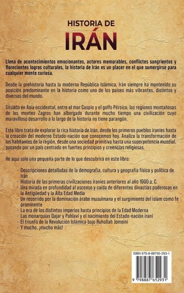 Llena de acontecimientos emocionantes, actores memorables, conflictos sangrientos y florecientes logros culturales, la historia de Irán es un placer en el que sumergirse para cualquier mente curiosa. Desde la prehistoria hasta la moderna República Islámica, Irán siempre ha mantenido su posición predominante en la historia como uno de los países más vibrantes, distintos y diversos del mundo. Situado en Asia occidental, entre el mar Caspio y el golfo Pérsico, las regiones montañosas de los montes Zagros han albergado durante mucho tiempo una civilización cuyo maravilloso desarrollo a lo largo de la historia no tiene parangón. Este libro trata de explorar la rica historia de Irán, desde los primeros pueblos iraníes hasta la creación del moderno Estado-nación que conocemos hoy. Analiza la transformación de los habitantes de la región, desde una sociedad primitiva hasta una superpotencia mundial, pasando por un país centrado en fuertes principios y creencias religiosas. He aquí solo una pequeña parte de lo que descubrirá en este libro: Descripciones detalladas de la demografía, cultura y geografía física y política de Irán Historia de las primeras civilizaciones iraníes anteriores al año 1000 a. C. Una mirada en profundidad al ascenso y caída de diferentes dinastías poderosas en la Antigüedad y la Alta Edad Media Un recorrido por la dominación árabe musulmana y el surgimiento del islam como fe prominente La era de los distintos imperios hasta principios de la Edad Moderna Las monarquías Qajar y Pahlaví y el nacimiento del Estado-nación iraní El triunfo de la Revolución Islámica bajo Ruhollah Jomeini Y mucho, ¡mucho más!