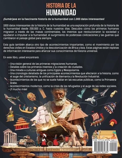 ¡Sumérjase en la fascinante historia de la humanidad con 1.000 datos interesantes! 1000 datos interesantes de la historia de la humanidad es una exploración profunda de la historia de la humanidad desde 200.000 a. C. hasta nuestros días. Descubra cómo los primeros humanos migraron a través de las masas continentales, los inventos que revolucionaron la sociedad y ayudaron a impulsar a la humanidad, el surgimiento de poderosas civilizaciones y las guerras que cambiaron el paisaje global para siempre. Esta guía también abarca otro tipo de acontecimientos importantes, como el movimiento por los derechos civiles en Estados Unidos y la descolonización de África y Asia. Estas páginas están repletas de información interesante para afianzar sus conocimientos de historia universal. En este libro, usted encontrará: Una visión general de las primeras migraciones humanas. Detalles sobre los primeros inventos y la creación de ciudades. Una mirada a culturas antiguas como Egipto y Mesopotamia. Una cronología detallada de los principales acontecimientos que afectaron a la historia, como el auge del cristianismo, la unificación de Alemania y la Revolución Industrial. Acontecimientos de los que no se suele hablar en las escuelas públicas, como la Primavera Árabe. Acontecimientos modernos, como la crisis de los refugiados y el auge de las redes sociales. ¡Y mucho más!