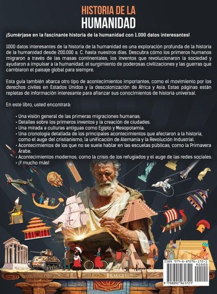 ¡Sumérjase en la fascinante historia de la humanidad con 1.000 datos interesantes! 1000 datos interesantes de la historia de la humanidad es una exploración profunda de la historia de la humanidad desde 200.000 a. C. hasta nuestros días. Descubra cómo los primeros humanos migraron a través de las masas continentales, los inventos que revolucionaron la sociedad y ayudaron a impulsar a la humanidad, el surgimiento de poderosas civilizaciones y las guerras que cambiaron el paisaje global para siempre. Esta guía también abarca otro tipo de acontecimientos importantes, como el movimiento por los derechos civiles en Estados Unidos y la descolonización de África y Asia. Estas páginas están repletas de información interesante para afianzar sus conocimientos de historia universal. En este libro, usted encontrará: Una visión general de las primeras migraciones humanas. Detalles sobre los primeros inventos y la creación de ciudades. Una mirada a culturas antiguas como Egipto y Mesopotamia. Una cronología detallada de los principales acontecimientos que afectaron a la historia, como el auge del cristianismo, la unificación de Alemania y la Revolución Industrial. Acontecimientos de los que no se suele hablar en las escuelas públicas, como la Primavera Árabe. Acontecimientos modernos, como la crisis de los refugiados y el auge de las redes sociales. ¡Y mucho más!