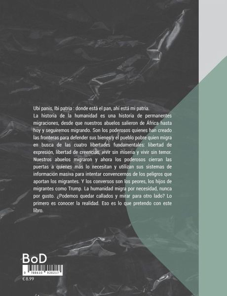 Ubi panis, Ibi patria : donde está el pan, ahí está mi patria. La historia de la humanidad es una historia de permanentes migraciones, desde que nuestros abuelos salieron de África hasta hoy y seguiremos migrando. Son los poderosos quienes han creado las fronteras para defender sus bienes y el pueblo pobre quien migra en busca de las cuatro libertades fundamentales: libertad de expresión, libertad de creencias, vivir sin miseria y vivir sin temor. Nuestros abuelos migraron y ahora los poderosos cierran las puertas a quienes más lo necesitan y utilizan sus sistemas de información masiva para intentar convencernos de los peligros que aportan los migrantes. Y los conversos son los peores, los hijos de migrantes como Trump. La humanidad migra por necesidad, nunca por gusto. ¿Podemos quedar callados y mirar para otro lado? Lo primero es conocer la realidad. Eso es lo que pretendo con este libro.