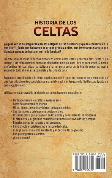 ¿Alguna vez se ha preguntado por los antiguos celtas de Irlanda y qué los convertía en lo que eran? ¿Sabía que Halloween se originó gracias a ellos, que inventaron el arpa o que blandían espadas de hasta un metro de longitud? En este libro descubrirá hechos históricos celtas como estos y muchos más. Tanto si ya conoce a los celtas como si nunca ha oído hablar de ellos, este libro es para usted. Si desea profundizar en sus vidas, su cultura y la herencia celta de la Irlanda moderna, podrá encontrar todo ello en esta completa y fascinante guía. En nuestra introducción a la historia celta, conocerá todos los aspectos de la vida celta de una forma fácilmente accesible, con material visual y un lenguaje de fácil lectura (¡nada de jerga académica!). Lo llevaremos a través de la historia celta explicándole lo siguiente: De dónde venían los celtas y quiénes eran. Cómo se asentaron en Irlanda. Mitos, dioses, leyendas y héroes celtas esenciales. Sus festivales y celebraciones estacionales. Historias clave que influyeron en los celtas y en los irlandeses modernos. El arte celta y su gloriosa evolución e influencia a través de los tiempos. Rituales celtas del pasado y del presente. Cómo afectó el cristianismo a la sociedad celta. El auge del cristianismo en Irlanda y el declive del paganismo. Por qué importan los celtas. ¡Y mucho más!