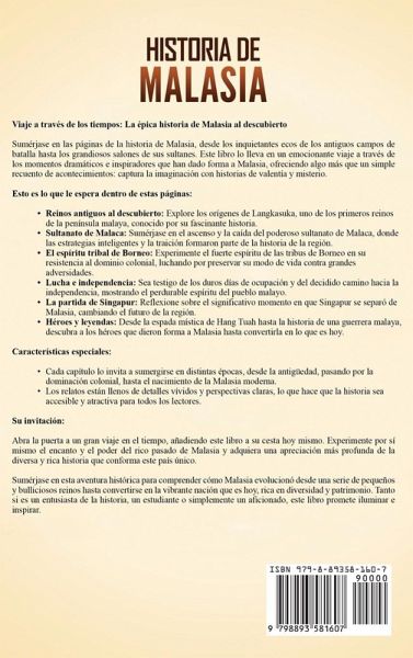 Viaje a través de los tiempos: La épica historia de Malasia al descubierto Sumérjase en las páginas de la historia de Malasia, desde los inquietantes ecos de los antiguos campos de batalla hasta los grandiosos salones de sus sultanes. Este libro lo lleva en un emocionante viaje a través de los momentos dramáticos e inspiradores que han dado forma a Malasia, ofreciendo algo más que un simple recuento de acontecimientos: captura la imaginación con historias de valentía y misterio. Esto es lo que le espera dentro de estas páginas: Reinos antiguos al descubierto: Explore los orígenes de Langkasuka, uno de los primeros reinos de la península malaya, conocido por su fascinante historia. Sultanato de Malaca: Sumérjase en el ascenso y la caída del poderoso sultanato de Malaca, donde las estrategias inteligentes y la traición formaron parte de la historia de la región. El espíritu tribal de Borneo: Experimente el fuerte espíritu de las tribus de Borneo en su resistencia al dominio colonial, luchando por preservar su modo de vida contra grandes adversidades. Lucha e independencia: Sea testigo de los duros días de ocupación y del decidido camino hacia la independencia, mostrando el perdurable espíritu del pueblo malayo. La partida de Singapur: Reflexione sobre el significativo momento en que Singapur se separó de Malasia, cambiando el futuro de la región. Héroes y leyendas: Desde la espada mística de Hang Tuah hasta la historia de una guerrera malaya, descubra a los héroes que dieron forma a Malasia hasta convertirla en lo que es hoy. Características especiales: Cada capítulo lo invita a sumergirse en distintas épocas, desde la antigüedad, pasando por la dominación colonial, hasta el nacimiento de la Malasia moderna. Los relatos están llenos de detalles vívidos y perspectivas claras, lo que hace que la historia sea accesible y atractiva para todos los lectores.