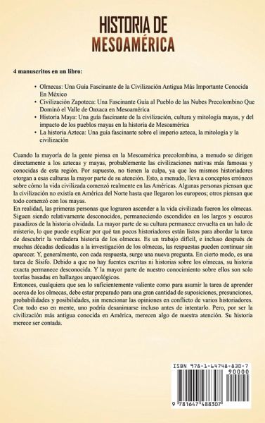 5 manuscritos completos en 1 libroOlmecas: Una Guía Fascinante de la Civilización Antigua Más Importante Conocida En México (Libro en Español/Olmecs Spanish Book Version) Civilización Zapoteca: Una Fascinante Guía al Pueblo de las Nubes Precolombino Que Dominó el Valle de Oaxaca en Mesoamérica (Libro en Español/Zapotec Civilization Spanish Book Version) Historia Maya: Una guía fascinante de la civilización, cultura y mitología mayas, y del impacto de los pueblos mayas en la historia de Mesoamérica La historia azteca: Una guía fascinante sobre el imperio azteca, la mitología y la civilización La primera parte de este libro incluye:Hallazgos revolucionarios proporcionados por técnicas modernas de investigación arqueológica Una explicación simple de quiénes eran los olmecas y de dónde vinieron Fascinantes descubrimientos del arte olmeca Teorías sorprendentes sobre la estructura de la sociedad olmeca y cómo interactuaron con sus vecinos ¡Y mucho, mucho más! Segunda parte de este libro, usted:El Pueblo de las Nubes y sus Dominios. El Valle de Oaxaca Entendiendo a los Zapotecas y las Etapas de la Fundación de Monte Albán Raíces Agrarias y Construcción de la Civilización Religión, Mitos, Sacrificios, Rituales y estructura de Poder La Familia Real y las Clases Sociales Orden Religioso Un Día Común en la Vida de los Zapotecas Artes, Deportes y Tecnología La Guerra contra los Aztecas ¡Esto y mucho más que no querrás perderte! Tercera parte de este libro, usted:Hallazgos revolucionarios proporcionados por modernas técnicas de detección arqueológica Una simple explicación de la civilización maya y su ubicación Descubrimientos fascinantes del arte maya Notable perspicacia en el gobierno y la sociedad maya Una sorprendente exploración de la vida cotidiana de los mayas Y mucho, ¡mucho más! Cuatro parte de este libro, usted:¿Dónde vivían los aztecas? La verdad sobre quiénes eran realmente los aztecas Revelaciones importantes sobre el gobierno, ciudades-estado y la expansión La llegada de los españoles y la decadencia del imperio Un día en la vida de un ciudadano azteca ¡Y mucho, mucho más! ¡Obtenga el libro ahora para conocer más sobre Historia de Mesoamérica!