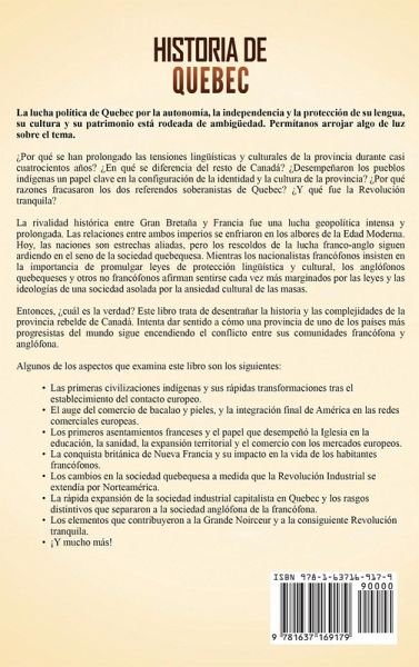 La lucha política de Quebec por la autonomía, la independencia y la protección de su lengua, su cultura y su patrimonio está rodeada de ambigüedad. Permítanos arrojar algo de luz sobre el tema. ¿Por qué se han prolongado las tensiones lingüísticas y culturales de la provincia durante casi cuatrocientos años? ¿En qué se diferencia del resto de Canadá? ¿Desempeñaron los pueblos indígenas un papel clave en la configuración de la identidad y la cultura de la provincia? ¿Por qué razones fracasaron los dos referendos soberanistas de Quebec? ¿Y qué fue la Revolución tranquila? La rivalidad histórica entre Gran Bretaña y Francia fue una lucha geopolítica intensa y prolongada. Las relaciones entre ambos imperios se enfriaron en los albores de la Edad Moderna. Hoy, las naciones son estrechas aliadas, pero los rescoldos de la lucha franco-anglo siguen ardiendo en el seno de la sociedad quebequesa. Mientras los nacionalistas francófonos insisten en la importancia de promulgar leyes de protección lingüística y cultural, los anglófonos quebequeses y otros no francófonos afirman sentirse cada vez más marginados por las leyes y las ideologías de una sociedad asolada por la ansiedad cultural de las masas. Entonces, ¿cuál es la verdad? Este libro trata de desentrañar la historia y las complejidades de la provincia rebelde de Canadá. Intenta dar sentido a cómo una provincia de uno de los países más progresistas del mundo sigue encendiendo el conflicto entre sus comunidades francófona y anglófona. Algunos de los aspectos que examina este libro son los siguientes: Las primeras civilizaciones indígenas y sus rápidas transformaciones tras el establecimiento del contacto europeo. El auge del comercio de bacalao y pieles, y la integración final de América en las redes comerciales europeas. Los primeros asentamientos franceses y el papel que desempeñó la Iglesia en la educación, la sanidad, la expansión territorial y el comercio con los mercados europeos. La conquista británica de Nueva Francia y su impacto en la vida de los habitantes francófonos. Los cambios en la sociedad quebequesa a medida que la Revolución Industrial se extendía por Norteamérica. La rápida expansión de la sociedad industrial capitalista en Quebec y los rasgos distintivos que separaron a la sociedad anglófona de la francófona. Los elementos que contribuyeron a la Grande Noirceur y a la consiguiente Revolución tranquila. ¡Y mucho más!