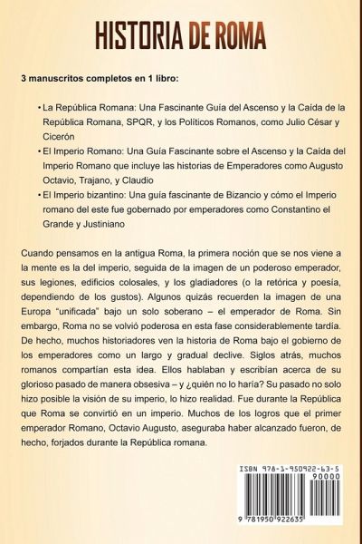 3 manuscritos completos en 1 libro La República Romana: Una Fascinante Guía del Ascenso y la Caída de la República Romana, SPQR, y los Políticos Romanos, como Julio César y Cicerón (Libro en Español/The Roman Republic Spanish Book) El Imperio Romano: Una Guía Fascinante sobre el Ascenso y la Caída del Imperio Romano que incluye las historias de Emperadores como Augusto Octavio, Trajano, y Claudio (Libro en Español/Roman Empire) El Imperio bizantino: Una guía fascinante de Bizancio y cómo el Imperio romano del este fue gobernado por emperadores como Constantino el Grande y Justiniano En este libro, veremos más de cerca el comienzo de la civilización romana, la fundación de la ciudad y el Senado, la expansión de la República romana, su gloria, y su final. La primera parte de este libro incluye: l Pasado que lo Hizo Posible: La Fundación de Roma entre Mito e Historia Abajo los Reyes: El Pasado que lo Causó Los Comienzos de la República Logros Militares de los Comienzos de la República: Tomar Italia En Medio de la República: Las Guerras Púnicas y el Dominio del Mediterráneo El Dominio Militar versus el Dominio Cultural: La Civilización Romana ante el Mundo Griego Poder Ilimitado y el Comienzo del Fin: El período final de la República La era de los Generales: Pompeyo, Craso y César segunda parte de este libro, usted: De la República al Imperio: El Ascenso de Octavio La Era de Augusto La Dinastía Julio - Claudia después de Augusto: Desde Tiberio hasta Nerón La Guerra Civil y el Año de los Cuatro Emperadores (AD 68–69) Dinastía Flavia La Dinastía Antonina: Los Cinco Emperadores Buenos (y un par no tan buenos) lgunos Emperadores Nuevos Crisis, Guerras Civiles, y Divisiones: El Declive Lento y Doloroso Los Dos Imperios: Este y Oeste ¡Todo esto y mucho más que no puedes perderte! Tercera parte de este libro, usted: Explorar una historia de poder y gloria, anarquía y orden, paganismo y cristianismo, guerra y paz, Occidente y Oriente Familiarizarse con las raíces de las grandes controversias que definieron la historia de Europa y la totalidad de la civilización occidental: el conflicto entre las iglesias católica y ortodoxa, y el que existe entre el cristianismo y el islam Descubrir historias de emperadores extraordinarios de los que nunca ha oído hablar y de la asombrosa valentía de héroes grecorromanos como Constantino Dragases, que resistió a los otomanos hasta el final, y Belisario, que luchó contra los persas para reconquistar lo que solía ser el Imperio Occidental Aprender más sobre toda la era llamada el Imperio bizantino más rápido que leyendo libros aburridos ¡Obtenga este libro ahora para aprender más sobre el Historia de Roma!