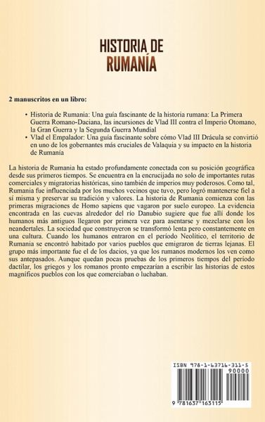 2 manuscritos completos en 1 libroHistoria de Rumania: Una guía fascinante de la historia rumana: La Primera Guerra Romano-Daciana, las incursiones de Vlad III contra el Imperio Otomano, la Gran Guerra y la Segunda Guerra Mundial Vlad el Empalador: Una guía fascinante sobre cómo Vlad III Drácula se convirtió en uno de los gobernantes más cruciales de Valaquia y su impacto en la historia de Rumanía Rumania fue reconocida internacionalmente en 1878, pero su historia es mucho más antigua. Para entender a la gente que habita este país, hay que retroceder miles de años y conocer al primer rey que…mehr