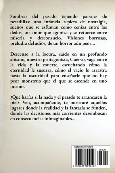 Cientos de lectores han disfrutado de la obra de Raúl Blank. Sombras del pasado tejiendo paisajes de pesadillas: una infancia repleta de nostalgia, sueños que se esfuman como ceniza entre los dedos, un amor que agoniza y se retuerce entre miseria y desconsuelo. Visiones borrosas, preludio del adiós, de un horror aún peor... Descenso a la locura, caído en un profundo abismo, nuestro protagonista, Cuervo, vaga entre la vida y la muerte, escuchando cómo la eternidad le susurra, cómo el vacío lo arrastra hasta la oscuridad para enseñarle que no hay peor monstruo que el que se esconde en uno mismo. ¿Qué harías si la nada y el pasado te arrancasen la piel? Ven, acompáñame, te mostraré aquellos lugares donde la realidad y la fantasía se funden, donde las decisiones más corrientes desembocan en consecuencias inimaginables...