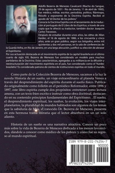 Como parte de la Colección Bezerra de Menezes, sacamos a la luz la novela Historia de un sueño, un viaje extraordinario al planeta Venus a través del desprendimiento del espíritu durante el sueño físico. Publicado originalmente como folletín en el periódico Reformador, entre 1896 y 1897, este libro espírita cumple dos propósitos: entretener como lectura amena, con un texto bien escrito e instruir como obra doctrinal, destacando en su contenido principios fundamentales del Espiritismo. . El sueño, el desprendimiento espiritual, los sueños, la evolución, los viajes interplanetarios, la pluralidad de mundos habitados son algunos de los temas que la sabiduría de Max, el conocido Dr. Bezerra de Menezes, presenta en esta hermosa trama literaria que el lector absorberá en un un solo aliento. Historia de un sueño es una narrativa atractiva. Conoce un poco más sobre la vida de Bezerra de Menezes dedicada a los menos favorecidos, dándole a conocer como médico de los pobres, y cómo fue su regreso al mundo espiritual.