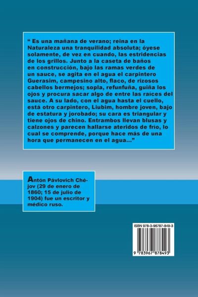 " Es una mañana de verano; reina en la Naturaleza una tranquilidad absoluta; óyese solamente, de vez en cuando, las estridencias de los grillos. Junto a la caseta de baños en construcción, bajo las ramas verdes de un sauce, se agita en el agua el carpintero Guerasim, campesino alto, flaco, de rizosos cabellos bermejos; sopla, refunfuña, guiña los ojos y procura sacar algo de entre las raíces del sauce. A su lado, con el agua hasta el cuello, está otro carpintero, Liubim, hombre joven, bajo de estatura y jorobado; su cara es triangular y tiene ojos de chino. Entrambos llevan blusas y calzones y parecen hallarse ateridos de frío, lo cual se comprende, porque hace más de una hora que permanecen en el agua..."