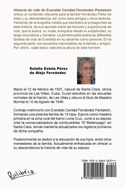 Historia de vida de Everaldo Caridad Fernández Pantaleón ofrece un contenido relevante para la familia Fernández Pérez de Alejo y su descendencia, así como para amigos u otros lectores. Partiendo de la biografía inédita que escribiera el protagonista de esta historia, de sus apuntes sobre las lecturas y experiencias de vida, que la autora, su viuda, enriquece desde su subjetividad, su larga convivencia y narrativa. La primera parte ilustra las diferentes facetas de vida de Everaldo en su ascenso como persona. En la segunda parte, los recuerdos memorables de la familia, amigos. Por último, cada lector valorará la altura de este hombre.