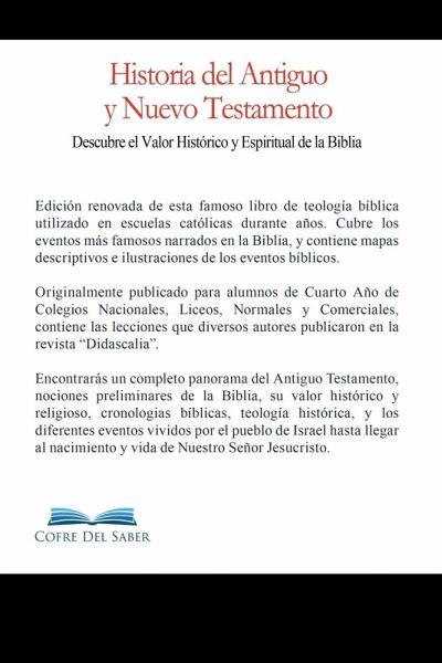 Edición renovada de esta famoso libro de teología bíblica utilizado en escuelas católicas durante años. Cubre los eventos más famosos narrados en la Biblia, y contiene mapas descriptivos e ilustraciones de los eventos bíblicos. Originalmente publicado para alumnos de Cuarto Año de Colegios Nacionales, Liceos, Normales y Comerciales, contiene las lecciones que diversos autores publicaron en la revista "Didascalia". Encontrarás un completo panorama del Antiguo Testamento, nociones preliminares de la Biblia, su valor histórico y religioso, cronologias bíblicas, teología histórica, y los diferentes eventos vividos por el pueblo de Israel hasta llegar al nacimiento y vida de Nuestro Señor Jesucristo.