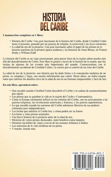 2 manuscritos completos en 1 libro: Historia del Caribe: Una guía fascinante de la historia del Caribe, desde Cristóbal Colón hasta el presente, pasando por las guerras de religión, la esclavitud y las leyes coloniales La edad de oro de la piratería: Una guía fascinante sobre el papel de los piratas en la historia marítima de la primera época moderna y las historias de Anne Bonny, sir Francis Drake y William Kidd La historia del Caribe es un viaje emocionante, pero pocos fuera de la región saben mucho sobre ella más allá del descubrimiento de Colón. Este libro lo guiará a través de la historia de la región, que fue testigo de algunos de los eventos más importantes del mundo. Comenzaremos con el descubrimiento accidental de Cristóbal Colón y la carrera por el control de las islas del Caribe. La primera parte de este libro tiene mucho material interesante, que incluye: Qué sucedió cuando Cristóbal Colón descubrió el Caribe y la cadena de acontecimientos que siguió. Los piratas que se ganaban la vida en la región del Caribe y Centroamérica. Cómo la Europa continental influyó en las colonias del Caribe, con un acercamiento a las guerras religiosas, las revoluciones americana y francesa, y las guerras napoleónicas. Lo que sucedió cuando las naciones del Caribe anhelaron liberarse de sus poderes coloniales para independizarse. Participación de los Estados Unidos en el Caribe, incluida la Guerra Hispanoamericana. Las dictaduras de algunas naciones caribeñas que dejaron atrás la brutalidad y la ruina financiera. El dictador que se pondría del lado de un adversario de los Estados Unidos durante uno de los momentos más críticos de la historia mundial. Las luchas que enfrenta el Caribe hoy y cómo podría ser su futuro. La historia de la edad de oro de la piratería, la que ha dado forma a la concepción moderna de un pirata, es compleja y larga, con mucha información que abarcar. Hasta ahora no existía un tomo que tratara los detalles clave de la edad de oro en un formato comprensible y fácil de leer. La segunda parte de este libro será tu guía a la era dorada de la piratería, y al leerla descubrirás lo siguiente: Las bases y rutas piratas originales. Una breve historia de la piratería antes de la edad de oro. Historias de varios piratas destacados, tanto hombres como mujeres. Historias increíbles de viajes a través de los océanos Atlántico e Índico. Los entresijos de la vida cotidiana de un pirata. Diversos mitos y leyendas relacionados con los piratas que persisten en la actualidad. Diferentes formas en que la ley trataba a los piratas de la época. Cómo funcionaban los piratas tanto en tierra como en el mar. Cómo la presencia de piratas en la época afectó a la ley y a la vida cotidiana de la gente normal. Y mucho, mucho más.