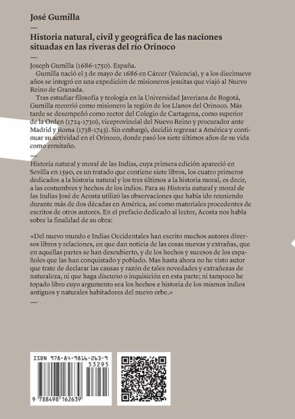 Historia natural, civil y geográfica de las naciones situadas en las riveras del río Orinoco fue escrita por José Gumilla tras vivir en América donde se interesó por el estudio de la historia natural. Mientras, como miembro de la Compañía de Jesús, se enfrascaba en la evangelización. El padre Gumilla fue un hombre de acción y un investigador acucioso de las ciencias naturales, de la medicina indígena, de la Geografía, la Economía y de los idiomas de los pobladores de la cuenca del Orinoco. Fundó varias poblaciones en los ríos Apure, Meta y en el propio Orinoco. Sus notas y escritos sobre el río Orinoco sirvieron durante mucho tiempo, como necesaria referencia para todos los científicos interesados en la naturaleza de la zona intertropical, incluyendo, obviamente, a Alejandro de Humboldt y muchos otros viajeros del siglo XIX. La primera diligencia de un perito Arquitecto, a quien un gran Señor encarga la fábrica de un magnífico Palacio, es formar en su mente la idea, y después, mediante las proporciones del compás y la regla, hacer visibles en un Plan las singulares maniobras que dibujó en su fantasía: diligencia precisa, pero no suficiente para todos; porque si bien el diestro en la facultad a la primera vista de aquel ceñido pitipié formará cabal concepto de la soberbia máquina que representa, al contrarío, para el no versado en ella es precisa larga explicación, para que comprenda el diseño. A ese modo y por el mismo fin, en la fábrica (no magnífica, sino natural) de esta historia gravé en su frontispicio todo el terreno, sobre que a paso lento girará mi pluma, individuando variedad de curiosas noticias. Para que los que están en los términos de la Geometría, comprendan la situación y altura polar, así del Orinoco, como de sus vertientes y terrenos que fecundan, vasta la primera ojeada del Plan propuesto; pero como no escribo para solos los doctos, habré de acompañar al Orinoco, desde las vertientes que hoy están descubiertas, hasta que con inmenso caudal rinde al Océano su tributo, endulzando por muchas leguas sus amargas espumas.