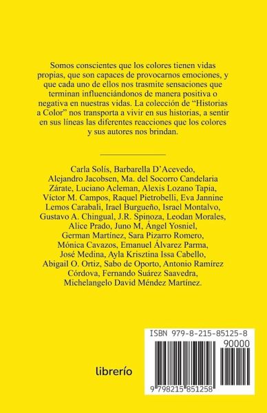 Somos conscientes que los colores tienen vidas propias, que son capaces de provocarnos emociones, y que cada uno de ellos nos trasmite sensaciones que terminan influenciándonos de manera positiva o negativa en nuestras vidas. La colección de "Historias a Color" nos transporta a vivir en sus historias, a sentir en sus líneas las diferentes reacciones que los colores y sus autores nos brindan. Carla Solís, Barbarella D'Acevedo, Alejandro Jacobsen, Ma. del Socorro Candelaria Zárate, Luciano Acleman, Alexis Lozano Tapia, Víctor M. Campos, Raquel Pietrobelli, Eva Jannine Lemos Carabali, Irael Burgueño, Israel Montalvo, Gustavo A. Chingual, J.R. Spinoza, Leodan Morales, Alice Prado, Juno M, Ángel Yosniel, German Martínez, Sara Pizarro Romero, Mónica Cavazos, Emanuel Álvarez Parma, José Medina, Ayla Krisztina Issa Cabello, Abigail O. Ortiz, Sabo de Oporto, Antonio Ramírez Córdova, Fernando Suárez Saavedra, Michelangelo David Méndez Martínez.