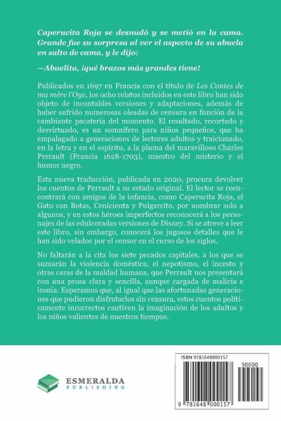 Caperucita Roja se desnudó y se metió en la cama. Grande fue su sorpresa al ver el aspecto de su abuela en salto de cama, y le dijo: -Abuelita, ¡qué brazos más grandes tiene! Publicados en 1697 en Francia con el título de Les Contes de ma mère l'Oye, los ocho relatos incluidos en este libro han sido objeto de incontables versiones y adaptaciones, además de haber sufrido numerosas oleadas de censura en función de la cambiante pacatería del momento. El resultado, recortado y desvirtuado, es un somnífero para niños pequeños, que ha empalagado a generaciones de lectores adultos y traicionado, en la letra y en el espíritu, a la pluma del maravilloso Charles Perrault (Francia 1628-1703), maestro del misterio y el humor negro. Esta nueva traducción, publicada en 2020, procura devolver los cuentos de Perrault a su estado original. El lector se reencontrará con amigos de la infancia, como Caperucita Roja, el Gato con Botas, Cenicienta y Pulgarcito, por nombrar solo a algunos, y en estos héroes imperfectos reconocerá a los personajes de las edulcoradas versiones de Disney. Si se atreve a leer este libro, sin embargo, conocerá los jugosos detalles que le han sido velados por el censor en el curso de los siglos. No faltarán a la cita los siete pecados capitales, a los que se sumarán la violencia doméstica, el nepotismo, el incesto y otras caras de la maldad humana, que Perrault nos presentará con una prosa clara y sencilla, aunque cargada de malicia e ironía. Esperamos que, al igual que las afortunadas generaciones que pudieron disfrutarlos sin censura, estos cuentos políticamente incorrectos cautiven la imaginación de los adultos y los niños valientes de nuestros tiempos. Discover what really happened to Little Red Riding Hood, how the Puss got his Boots, and whether Sleeping Beauty really lived happily ever after. A master of fantasy, mystery and irony, Charles Perrault (France 1628-1703) is mostly known as a children's author, although his intended public were bourgeois adults who also read these cruel, politically-incorrect stories to their children to warn them of the dangers of the world, while having a good a time and sharing some laughs before bed. This new Spanish version of Les Contes de ma mère l'Oye (1697) includes eight short stories, and has been translated faithfully to reflect Perrault's simple, clear style.
