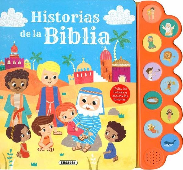Pulsa los botones y disfruta escuchando cinco inspiradoras historias de la Biblia. Conoce a los protagonistas: Adán y Eva; Daniel (y los leones); David y Goliat; Moisés, y Jonás (y la ballena).
