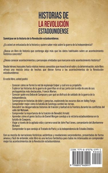 Sumérjase en la historia de la Revolución estadounidense. ¿Es usted un entusiasta de la historia y quiere saber más sobre la guerra de la Independencia? ¿Busca un libro de historia que contenga algo más que los datos habituales sobre un acontecimiento histórico concreto? ¿Desea conocer acontecimientos y personajes olvidados que marcaron este acontecimiento histórico? En este libro, usted podrá: Conocer cómo se formó la red de espionaje Culper y cuál era su propósito. Explorar las historias de la guerra de guerrillas en el sur, junto con la vida de uno de sus protagonistas más destacados, Francis Marion. Conocer quién era Deborah Sampson y por qué se disfrazó de soldado de la guerra de la Independencia. Sumergirse en historias de dolor y penurias, explorando los oscuros días en Valley Forge. Comprender mejor cómo la batalla de Saratoga cambió las tornas. Descubrir las desgarradoras historias de traición y lealtad en la frontera durante los conflictos del valle del Mohawk. Comprender la importancia de la traición de Benedict Arnold. Aprender cómo el genio táctico de Daniel Morgan condujo a la victoria estadounidense en la batalla de Cowpens. Viajar a través de la agitada vida y carrera naval de John Paul Jones, comandante del Bonhomme Richard. Comprender lo que condujo al Tratado de París y a la independencia de Estados Unidos.