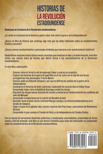 Sumérjase en la historia de la Revolución estadounidense. ¿Es usted un entusiasta de la historia y quiere saber más sobre la guerra de la Independencia? ¿Busca un libro de historia que contenga algo más que los datos habituales sobre un acontecimiento histórico concreto? ¿Desea conocer acontecimientos y personajes olvidados que marcaron este acontecimiento histórico? En este libro, usted podrá: Conocer cómo se formó la red de espionaje Culper y cuál era su propósito. Explorar las historias de la guerra de guerrillas en el sur, junto con la vida de uno de sus protagonistas más destacados, Francis Marion. Conocer quién era Deborah Sampson y por qué se disfrazó de soldado de la guerra de la Independencia. Sumergirse en historias de dolor y penurias, explorando los oscuros días en Valley Forge. Comprender mejor cómo la batalla de Saratoga cambió las tornas. Descubrir las desgarradoras historias de traición y lealtad en la frontera durante los conflictos del valle del Mohawk. Comprender la importancia de la traición de Benedict Arnold. Aprender cómo el genio táctico de Daniel Morgan condujo a la victoria estadounidense en la batalla de Cowpens. Viajar a través de la agitada vida y carrera naval de John Paul Jones, comandante del Bonhomme Richard. Comprender lo que condujo al Tratado de París y a la independencia de Estados Unidos.
