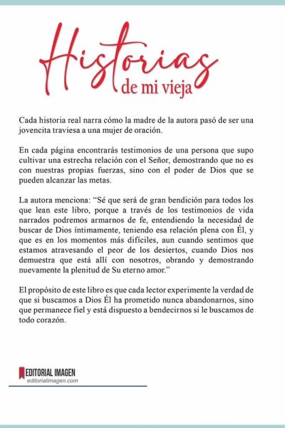 Cada historia real narra cómo la madre de la autora pasó de ser una jovencita traviesa a una mujer de oración. En cada página encontrarás testimonios de una persona que supo cultivar una estrecha relación con el Señor, demostrando que no es con nuestras propias fuerzas, sino con el poder de Dios que se pueden alcanzar las metas. La autora menciona: "Sé que será de gran bendición para todos los que lean este libro, porque a través de los testimonios de vida narrados podremos armarnos de fe, entendiendo la necesidad de buscar de Dios íntimamente, teniendo esa relación plena con Él, y que es en los momentos más difíciles, aun cuando sentimos que estamos atravesando el peor de los desiertos, cuando Dios nos demuestra que está allí con nosotros, obrando y demostrando nuevamente la plenitud de Su eterno amor." El propósito de este libro es que cada lector experimente la verdad de que si buscamos a Dios Él ha prometido nunca abandonarnos, sino que permanece fiel y está dispuesto a bendecirnos si le buscamos de todo corazón.