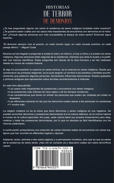 ¿Te has preguntado alguna vez sobre la existencia de seres malignos invisibles entre nosotros? ¿Te gustaría saber cuáles son los casos más impactantes de encuentros con demonios en la historia? ¿Porqué algunas personas son más susceptibles al ataque de estos seres? Entonces sigue leyendo.. "El demonio siempre vive al acecho, en cada remoto lugar, en cada morada sombría, en cada pasaje tétrico." - Miguel Costa Muchos se han llegado a preguntar si existe el cielo y el infierno, si hay un Dios y si existen los seres malignos. Algunas personas están seguras de su existencia, mientras que otras lo dudan y lo justifican con hechos científicos. Estas preguntas son típicas de la raza humana y se han realizado desde los inicios de nuestra historia. Si algo ha acompañado la creencia en seres divinos, es la creencia en seres malignos. Desde que comenzaron las primeras religiones, se le pudo asignar un nombre a los extraños y terribles acontecimientos que padecían algunas personas, llamándolos influencias demoniacas. Existen grabados y pinturas antiguas que representan estos terribles acontecimientos e historias. En este libro descubrirás: -Los casos más impactantes de posesiones y encuentros con seres malignos. -Las posesiones más infames de hace siglos y de los tiempos modernos. -Las características que tienen en similar las personas que suelen ser visitadas por entes no deseados. -Las diferentes maneras en las que los demonios suelen atacar a las personas no cautelosas. -Y mucho más.. La religión cristiana no es la única que tiene demonios y seres malignos en sus registros. Se pueden encontrar demonios y posesiones demoniacas el a la cultura islámica, en la cultura hebrea e incluso en la cultura japonesa. Así pues, cada cultura tiene sus propios lineamientos para diagnosticar y tratar las posesiones demoniacas, por lo que no siempre es fácil identificarlos con los mismos estándares. A continuación presentamos una colección de varias historias reales de encuentros con seres malignos que han ocurrido en diferentes lugares y épocas. Adelante, lector, atrévete a leer estas páginas y a permanecer incrédulo, sino que es que ya sabes de la existencia de estos seres. ¡Haz clic en comprar ya y descubre cuáles son estos terroríficos casos!