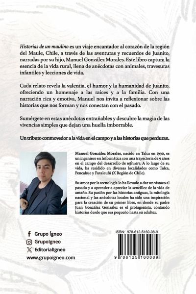 Historias de un maulino es un viaje encantador al corazón de la región del Maule, Chile, a través de las aventuras y recuerdos de Juanito, narradas por su hijo, Manuel González Morales. Este libro captura la esencia de la vida rural, llena de anécdotas con animales, travesuras infantiles y lecciones de vida. >Sumérgete en estas anécdotas entrañables y descubre la magia de las vivencias simples que dejan una huella imborrable Un tributo conmovedor a la vida en el campo y a las historias que perduran.