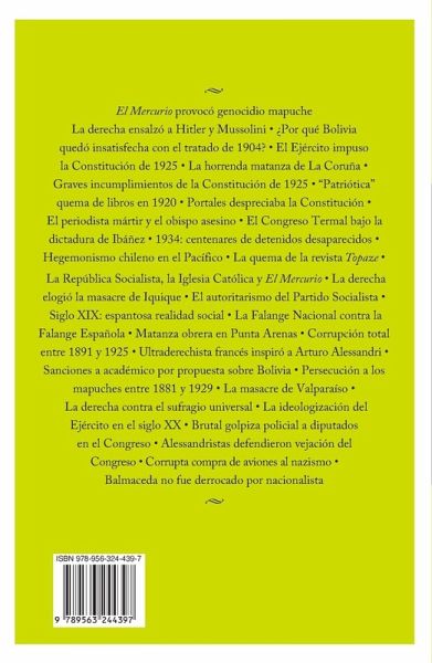 El autor rescata en este libro episodios claves de la historia de Chile que ponen en evidencia las pr cticas antidemocr ticas de la elite pol tica. Felipe Portales ha investigado minuciosamente cada uno de estos sorprendentes hechos de nuestra historia, generalmente ocultos o tergiversados en la historia oficial. ndice: El Mercurio provoc genocidio mapuche La derecha ensalz a Hitler y Mussolini Por qu Bolivia qued insatisfecha con el tratado de 1904? El Ej rcito impuso la Constituci n de 1925 La horrenda matanza de La Coru a Graves incumplimientos de la Constituci n de 1925 Patri tica quema de libros en 1920 Portales despreciaba la Constituci n El periodista m rtir y el obispo asesino El Congreso Termal bajo la dictadura de Ib ez 1934: centenares de detenidos desaparecidos Hegemonismo chileno en el Pac fico La quema de la revista Topaze La Rep blica Socialista, la Iglesia Cat lica y El Mercurio La derecha elogi la masacre de Iquique El autoritarismo del Partido Socialista Siglo xix: espantosa realidad social La Falange Nacional contra la Falange espa ola Matanza obrera en Punta Arenas Corrupci n total entre 1891 y 1925 Ultraderechista franc s inspir a Arturo Alessandri Sanciones a acad mico por propuesta sobre Bolivia Persecuci n a los mapuches entre 1881 y 1929 La masacre de Valpara so La derecha contra el sufragio universal La ideologizaci n del Ej rcito en el siglo xx Brutal golpiza policial a diputados en el Congreso Alessandristas defendieron vejaci n del Congreso Corrupta compra de aviones al nazismo Balmaceda no fue derrocado por nacionalista