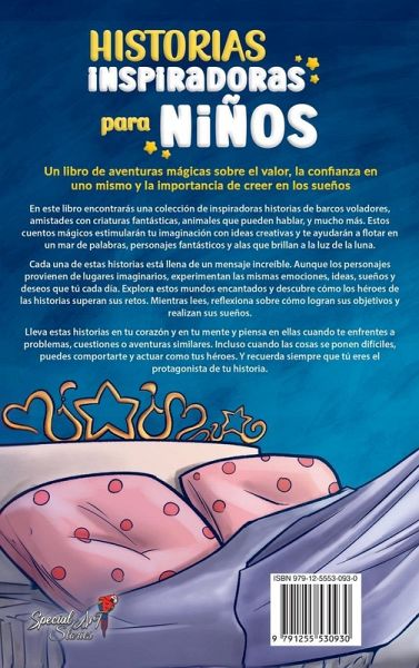 ¡Hola, joven lector! ¿Has soñado alguna vez con vivir una aventura o alcanzar tus metas? ¿Quizás te has imaginado ser un pirata? ¿O quizás un dragón que escupe fuego? ¿O una princesa o un príncipe con un castillo y un reino que gobernar? Es maravilloso cómo nuestra imaginación puede llevarnos a nuevos mundos y nuevas aventuras. ¿Cuántas veces en la vida real te has enfrentado a dificultades, has experimentado nuevas emociones, has querido desarrollar una pasión o has trabajado duro para realizar un proyecto? Todos hemos tenido experiencias similares de diferentes maneras. En este libro encontrarás una hermosa colección de historias inspiradoras. Cada uno de ellas está llena de un mensaje increíble. Aunque los personajes provienen de lugares imaginarios, experimentan las mismas emociones, ideas, sueños y deseos que tú experimentas cada día. Explora estos mundos de fantasía y descubre cómo los héroes de las historias superan sus retos. Mientras lees, reflexiona sobre cómo logran sus objetivos y realizan sus sueños. Lleva estas historias en tu corazón y en tu mente y piensa en ellas cuando te enfrentes a problemas, cuestiones o aventuras similares. Incluso, cuando las cosas se ponen difíciles, puedes comportarte y actuar como tus héroes. Y recuerda que tú eres el protagonista de tu propia historia. Lo que encontrarás en este libro: 10 historias inspiradoras para niños y niñas sobre ""autoestima, valor, fuerza interior y amor propio"". Un estilo de escritura sencillo y atractivo, adecuado tanto para la lectura compartida como para la independiente La identificación con los personajes, que siempre se combinan con temas de la vida real de los niños Bellas imágenes para acompañar la lectura y estimular la imaginación Moral y mensajes de la vida con reflexiones y participación en la narración A los niños y niñas les encanta este libro porque les ayuda a: Desarrollar la confianza en sí mismos y en sus capacidades Superar la timidez y la ansiedad Afrontar mejor las situaciones difíciles Superar los miedos y ser valientes Nunca rendirse y no desanimarse por los pequeños fracasos Creer en sus sueños Comprender la importancia de las relaciones con los padres y los amigos Sé curioso y sigue tus pasiones 2 Regalos para ti que puedes descargar del sitio web de Special Art: Diario de los sueños de los niños (PDF) Frases motivadoras para colorear para niños (PDF) Haz clic en ""comprar ahora"" ayuda a un niño o niña a no dejar de soñar y creer en sí mismos. (Una idea de regalo perfecta)