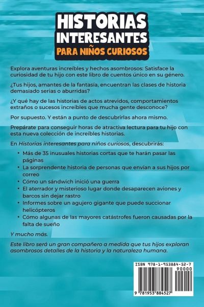 Explora aventuras increíbles y hechos asombrosos: Satisface la curiosidad de tu hijo con este libro de cuentos único en su género. ¿Tus hijos, amantes de la fantasía, encuentran las clases de historia demasiado serias o aburridas? ¿Se han preguntado si algunas historias realmente asombrosas del pasado tal vez nunca llegaron a los libros de su biblioteca? ¿Y qué hay de las historias de actos atrevidos, comportamientos extraños o sucesos increíbles que mucha gente desconoce? ¿Podrían estas historias estar ahí afuera, esperando a ser descubiertas? Por supuesto. Y están a punto de descubrirlas ahora mismo. Prepárate para conseguir horas de atractiva lectura para tu hijo con esta nueva colección de increíbles historias. En Historias interesantes para niños curiosos, descubrirás: Más de 35 inusuales historias cortas que te harán pasar las páginas La sorprendente historia de personas que envían a sus hijos por correo Cómo un sándwich inició una guerra El aterrador y misterioso lugar donde desaparecen aviones y barcos sin dejar rastro Informes sobre un agujero gigante que puede succionar helicópteros Por qué uno de los generales más temibles inició una guerra... contra los conejos La historia de supervivencia por excelencia: estar perdido en el mar durante 438 días Las cosas divertidas que tu hijo no aprende en la escuela pero que siempre se pregunta: "¿Cuál es la historia del ketchup? ¿Por qué se llama 'ketchup'?" Y mucho más. Si quieres descubrir increíbles historias verdaderas, aptas para niños y llenas de emoción en cada página, desplázate hacia arriba y haz clic en el botón "Agregar al Carrito" ahora mismo.