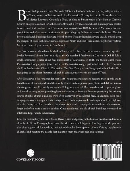Before independence from Mexico in 1836, the Catholic faith was the only religion settlers in Texas, known as Texians, could legally practice. To acquire land in Texas, then a part of Mexico known as Coahuila y Tejas, one had to be a member of the Roman Catholic Church or agree to convert to Catholicism. Although a few Protestant church buildings were erected before Texas's independence in 1836, most were erected after 1836 because of Mexico's strict laws prohibiting and often severe punishment for practicing any faith other than Catholicism. The few Protestant church buildings that were erected prior to Texas independence were usually erected along the margins of Texas in the more remote regions of North and East Texas, distancing themselves from Mexico's center of government in San Antonio. The first Protestant church established in Texas that has been in continuous service was organized by the Reverend Milton Estill in 1833 as the Cumberland Presbyterian Church in Old Shiloh, a small community located about four miles north of Clarksville. In 1848, the Shiloh Cumberland Presbyterian Congregation joined with the Presbyterian congregation in Clarksville to become the First Presbyterian Church, Clarksville. The First Presbyterian Congregation in Clarksville is recognized as the oldest Protestant church in continuous service in the state of Texas. After Texians won their independence in 1836, religious congregations began to meet openly and to build houses of worship. Most of these early church buildings were poorly built and did not survive the ravages of time. Eventually, stronger buildings were erected. But even then, with open fireplaces and wood-burning stoves providing heat and candles or kerosene lanterns providing the primary source of light, church buildings were often destroyed by accidental fires. In addition, with time, congregations often outgrew their vintage church buildings or could no longer afford the high cost of maintaining the older, outdated buildings. As a result, congregations abandoned them to erect larger and often more elaborate edifices. Once abandoned, the old church buildings were razed or, if left standing, rapidly deteriorated. Over the past twelve years, my wife and I have visited and photographed almost one thousand historic churches in Texas. Photographing these historic church buildings and learning about the pioneers that often at great risk founded and maintained them has been a project of love. Visiting these historic churches and meeting the people that maintain them today has been inspirational.