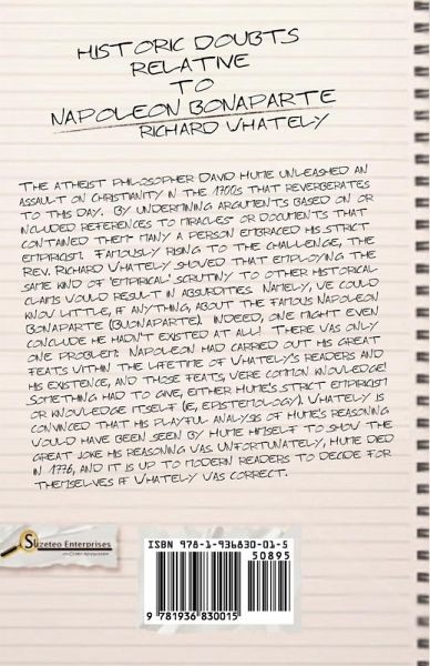 The atheist philosopher David Hume unleashed an assault on Christianity in the 1700s that reverberates to this day. By undermining arguments based on or included references to miracles- or documents that contained them- many a person embraced his strict empiricism. Famously rising to the challenge, the Rev. Richard Whately showed that employing the same kind of 'empirical' scrutiny to other historical claims would result in absurdities. Namely, we could know little, if anything, about the famous Napoleon Bonaparte (Buonaparte). Indeed, one might even conclude he hadn't existed at all! There was only one problem: Napoleon had carried out his great feats within the lifetime of Whately's readers and his existence, and those feats, were common knowledge! Something had to give, either Hume's strict empiricism or knowledge itself (ie, epistemology). Whately is convinced that his playful analysis of Hume's reasoning would have been seen by Hume himself to show the great joke his reasoning was. Unfortunately, Hume died in 1776, and it is up to modern readers to decide for themselves if Whately was correct.